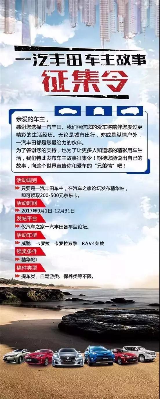 自2017年9月1日-12月31日,凡購買了一汽豐田品牌的車主朋友,為自己的愛車拍攝一套精美的寫真集,加上自己的購車經(jīng)歷及感受,在汽車之家論壇所屬的車型論壇中,發(fā)布帖子并且獲得汽車之家論壇認(rèn)可成為“精華帖”。完成以上步驟的朋友,請將精華帖鏈接、發(fā)帖昵稱、個人姓名及手機(jī)號碼私信發(fā)給“天嬌華運(yùn)通一汽豐田”公眾微信號(每月10號之前提交上月精華帖,逾期無效),經(jīng)過工作人員回復(fù)后,即可獲得200-500元京東卡!就這么容易!