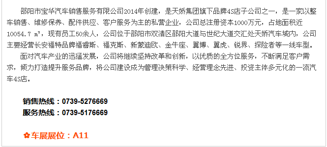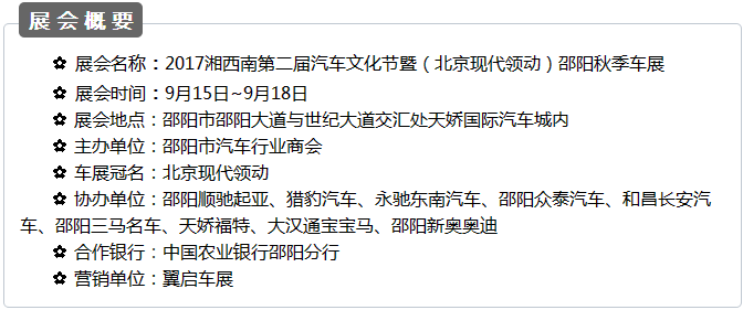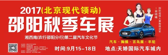【915-918邵陽秋季車展】 9月15日-9月18日,2017湘西南第二屆汽車文化節(jié)暨(北京現(xiàn)代領(lǐng)動(dòng))邵陽秋季車展將于天嬌國(guó)際汽車城隆重舉辦。本屆車展由邵陽市政府批準(zhǔn)、邵陽市汽車行業(yè)商會(huì)主辦、北京現(xiàn)代領(lǐng)動(dòng)冠名,邵陽順馳起亞、獵豹汽車、永馳東南汽車、邵陽眾泰汽車、和昌長(zhǎng)安汽車、邵陽三馬名車、天嬌福特、大漢通寶寶馬、邵陽新奧奧迪協(xié)辦,合作銀行為:中國(guó)農(nóng)業(yè)銀行股份有限公司邵陽分行。此次車展不僅僅是一場(chǎng)視覺的盛宴,更是一場(chǎng)震撼的汽車文化之旅!今天小編就給大家著重介紹一下此次車展冠名及協(xié)辦單位。